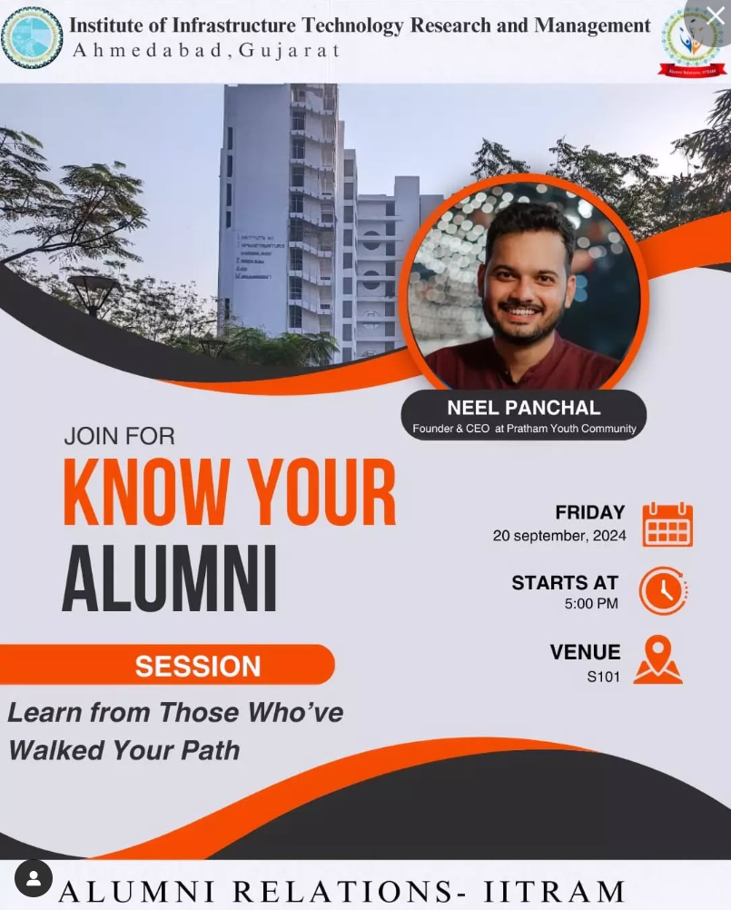 IITRAM hosted a KNOW YOUR ALUMNI session featuring Mr. Neel Panchal, CEO and Founder of Pratham Youth Community on September 20, 2024. The event provided students with valuable insights into Mr. Panchal's professional journey post-graduation. Attendees had the opportunity to learn from his experiences and gain guidance for their own career paths.